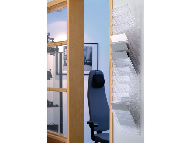 Med DURABLE FLEXIBOXX blackettfack kan du enkelt komma åt och hämta filer, broschyrer, post och litteratur. Detta DURABLE FLEXIBOXX blankettfack kan monteras i butiker, bibliotek, kontor och receptioner. Med 12 fack ger den här vertikala displayen snabb ordning på kontor och i väntrum, samtidigt som designen är enkel att installera. - Organisera pärmar, tidskrifter eller dokument - 12 separata fack för organisation - A4 liggande format - Material: Polystyren (PS) - Färg: Transparent - Mått: 1045x348x95 mm