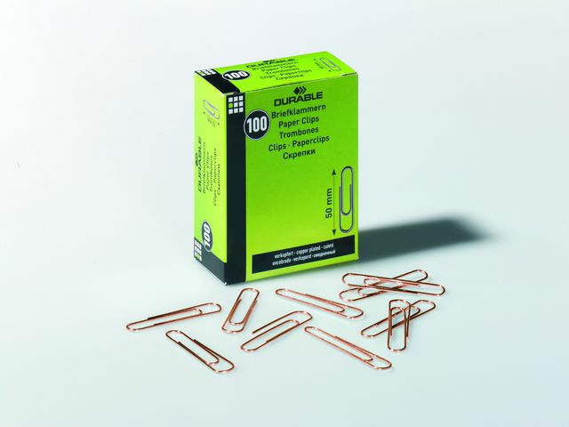 Bunta ihop dokument utan att behöva häfta med de här kopparbelagda pappersklämmorna från Durable. Fyll på med de här kopparbelagda pappersklämmorna från Durable – ett enkelt sätt att bunta ihop dokument utan permanenta häftklamrar. Det här paketet med pappersklämmor är perfekt att ha till hands på kontoret, hemma och i skolan. Den klassiska designen ger ett tillförlitligt grepp och håller ihop papper snyggt och prydligt. De här stora 50 mm kopparbelagda pappersklämmorna från Durable är ett smart sätt att hålla ordning på rapporter, räkningar eller skolarbete. - Håll ordning på pappersarbetet utan häftklamrar - Klassiska pappersklämmor i metall - Idealisk för hemmet, kontoret och skolan - Färg: Kopparbeläggning, nickelfri - Mått: 50 mm - Antal: 100