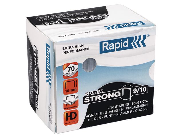 Unik, robust häftklammer. Särskilt utformad av RAPID för HD9. Ger bästa resultat någonsin. Högsta kvalitet och styrka Format: 9/10 häftklammer För häftning från 40 till 70 ark (80 g/m²) 10 mm benlängd Galvaniserad superstark tråd för bästa prestanda Vassa kanter för bästa genomträngning Färg: silver Förpackning: 5 000 - Lämpar sig för häftning av 40 till 70 ark 80 g/m²-papper - Varje förpackning innehåller 5 000 häftklamrar - De röda symbolerna förstärker segmenteringen ytterligare – SUPERSTARK - 10 mm benlängd - Galvaniserad superstark tråd för bästa prestanda - Vassa kanter för bästa genomträngning